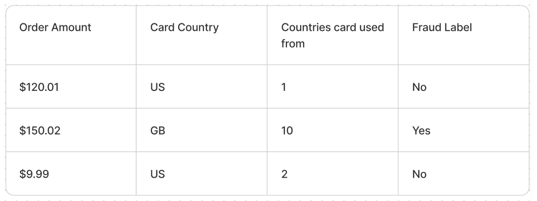 The key requirement for building an effective classifier is to identify discriminative features that can help separate fraudulent and legitimate orders. Some examples of features that can be extracted from order/transaction data: